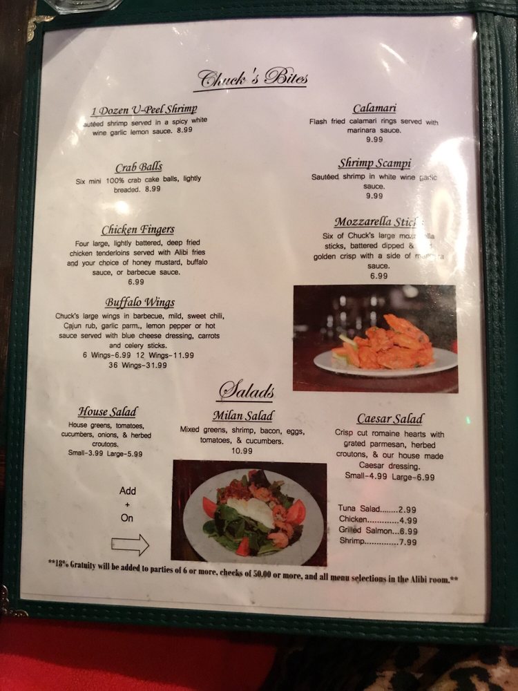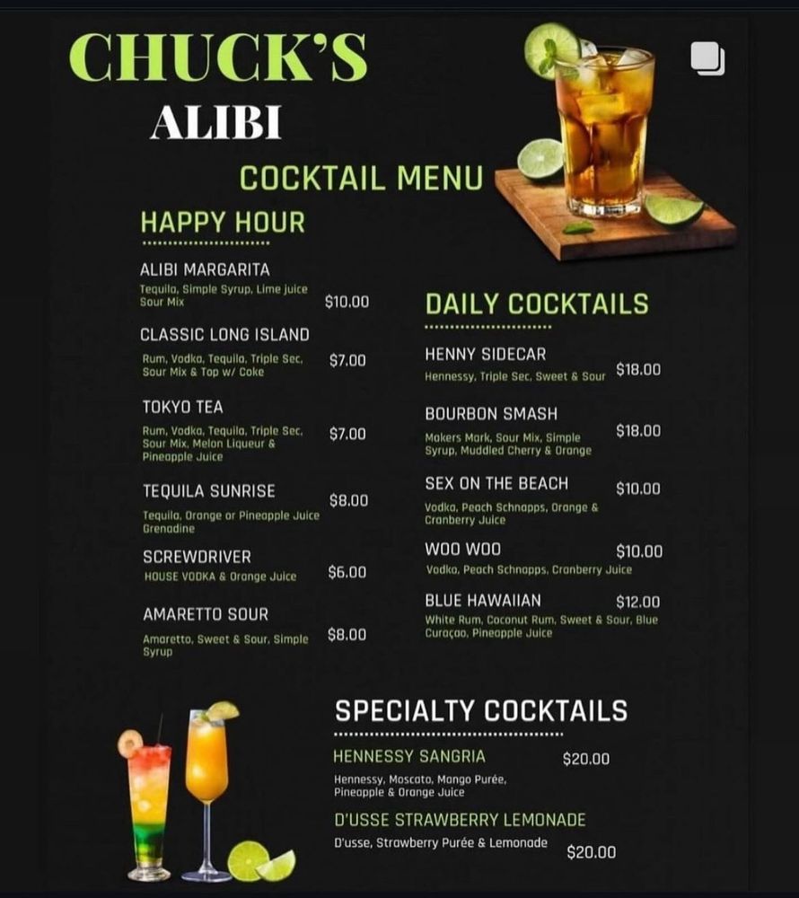 Chuck's Alibi, a fusion of Pasta Shops, Cocktail Bars, and Seafood, offers a vibrant dining experience at 7301 Oxford Ave, Philadelphia. This restaurant provides a range of utilities including reservation options, delivery, takeout, and a wheelchair-accessible entrance. The menu is diverse, featuring appetizers like Lobster Mac & Cheese, Jumbo Fried Shrimp, and Chicken Cheese Steak Egg Rolls. Salads such as the Alibi Salad with mixed greens and romaine lettuce are fresh and flavorful. Sandwich options like the Alibi Surf & Turf Burger showcase innovative combinations. Customers appreciate the great food, staff, and ambiance, with one reviewer praising the Happy Hour specials. Overall, Chuck's Alibi delivers a delicious dining experience with excellent service and a welcoming atmosphere.